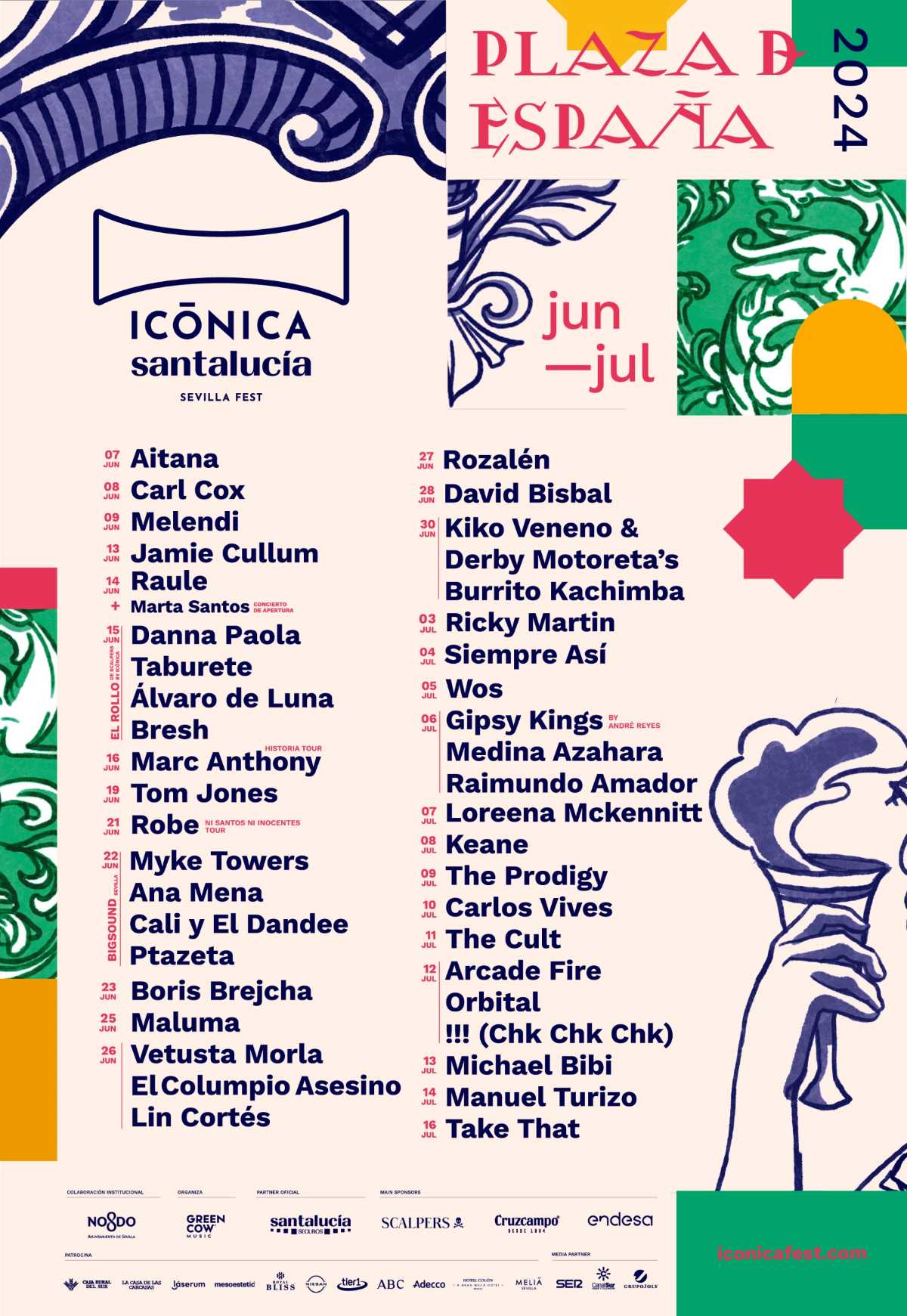 Entre los días 7 de junio y 16 de julio de 2024, la Plaza de España de Sevilla acogerá la IV edición de ICÓNICA SANTALUCÍA Sevilla Fest, el festival experiencial de la capital de Andalucía. Organizado por Green Cow Music, esta cita acogerá, en el emblemático escenario hispalense, a un gran y ecléctico compendio de artistas nacionales e internacionales, iconos de diversos estilos de la música, que en este 2024 son Aitana, Carl Cox, Melendi, Jamie Cullum, Marta Santos, Raule, El Rollo de Scalpers by Icónica con Danna Paola, Taburete, Álvaro de Luna y la Fiesta Bresh, Marc Anthony, Tom Jones, Robe, BIGSOUND Sevilla con Myke Towers, Ana Mena, Cali y El Dandee y Ptazeta, Boris Brejcha, Vetusta Morla, El Columpio Asesino, Lin Cortés, Rozalén, David Bisbal, Kiko Veneno, Derby Motoreta´s Burrito Kachimba, Ricky Martin, Siempre Así, Wos, Gipsy Kings, Medina Azahara, Raimundo Amador, Loreena Mckennitt, Keane, The Prodigy, Carlos Vives, The Cult, Arcade Fire, Orbital, !!! (Chk, Chk, Chk), Michael Bibi, Manuel Turizo y Take That. Las entradas para todos los conciertos están a la venta en http://www.iconicafest.com">www.iconicafest.com