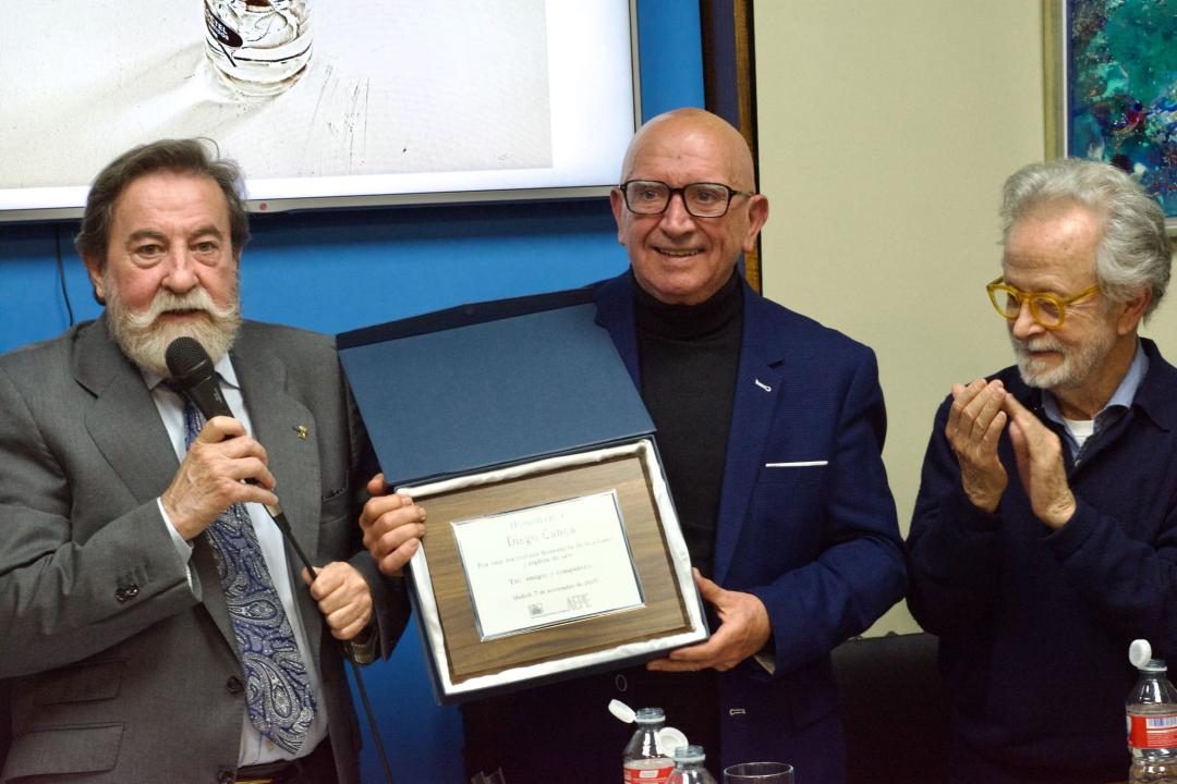 La ceremonia dio comienzo con una síntesis biográfica a cargo de Mª Dolores Barreda Pérez, secretaria general de la AEPE. Este repaso permitió al público conocer en profundidad los logros y la evolución creativa de Canca, ilustrando por qué su figura fue tan apreciada en los círculos artísticos. Seguidamente, tomó la palabra Pedro Touceda, periodista, escritor, guionista y director de cine, quien compartió anécdotas y reflexiones sobre la amistad y el trabajo conjunto con el homenajeado.