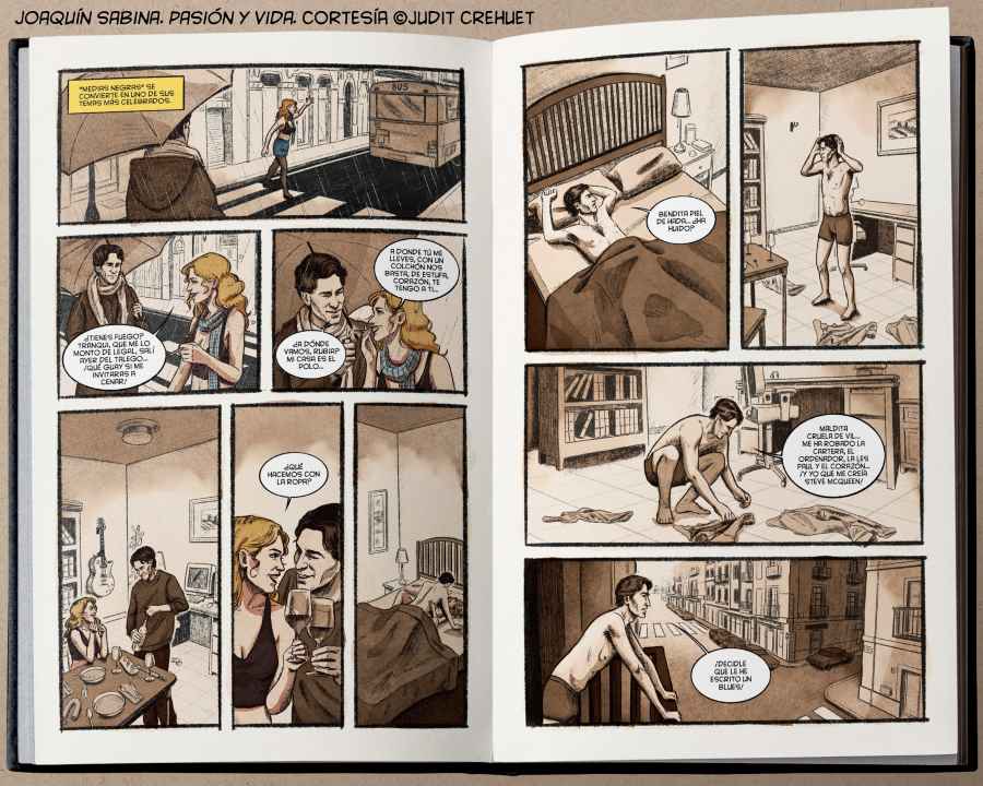 Uno de los aciertos es la integración de fragmentos líricos en el diseño: versos de “Eclipse de mar” o “¿Quién me ha robado el mes de abril?” fluyen entre imágenes, como si las propias canciones dialogaran con el lector. Los dibujantes también recrean momentos icónicos, como su explosivo éxito en Latinoamérica a principios de los 90, donde el Sabina “rocker” conquistó estadios sin perder su esencia de poeta maldito.