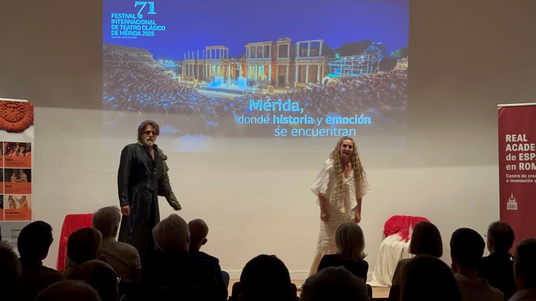 El Festival Internacional de Teatro Clásico de Mérida ha sido presentado este miércoles por primera vez en su historia en Italia con un acto celebrado en la Real Academia de España en Roma. La presentación ha contado con la participación del director del Festival, Jesús Cimarro, del consejero de Cultura de la Embajada de España, Carlos Tercero, y de la consejera de Cultura, Turismo, Jóvenes y Deportes de la Junta de Extremadura, Victoria Bazaga. Además, dos de los actores protagonistas de Ifigenia, Juanjo Artero y Laura Moreira, han representado un fragmento de la obra que se podrá disfrutar en Mérida el 15 y el 16 de julio y en el Festival de Ostia Antica de Roma los días 25 y 26 de julio.