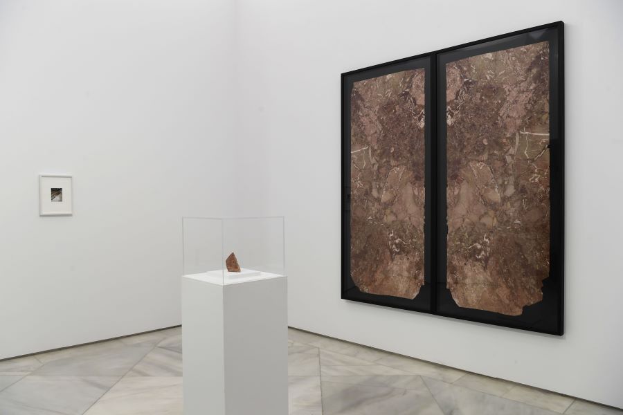 Amie Siegel. Dinastía, 2017. Fragmento de mármol, dos impresiones cromogénicas, impresión de pigmento de archivo, texto en vinilo. Vista de la exposición: Centro Andaluz de Arte Contemporáneo, Sevilla. photo: Cristina Quicler. © Amie Siegel