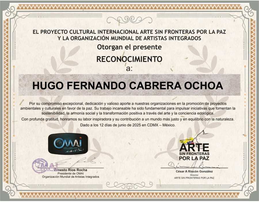 El reconocimiento, otorgado por el Proyecto Cultural Internacional Arte Sin Fronteras por la Paz y la Organización Mundial de Artistas Integrados, exalta el compromiso excepcional, la dedicación incansable y la valiosa contribución del maestro Cabrera Ochoa al fomento de proyectos ambientales y culturales en favor de la paz.