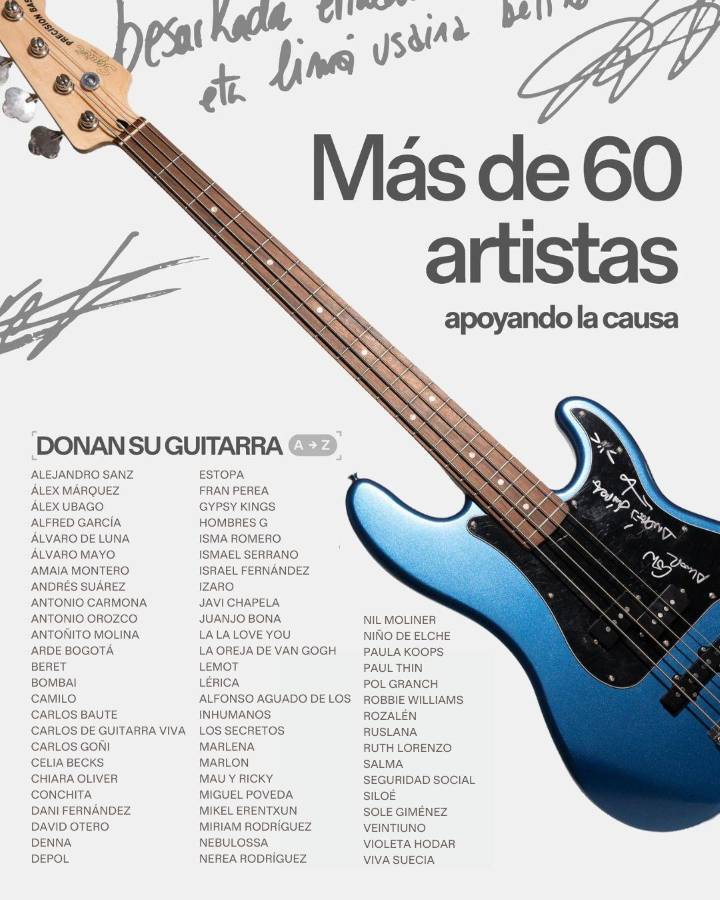 La Fundación Músicos por la Salud ha recaudado 94.466 euros en la subasta solidaria de guitarras de 65 artistas, en la que durante dos semanas se ha podido pujar online con el objetivo de recaudar dinero para los afectados por la DANA. En concreto, el dinero recaudado en las 27.728 pujas realizadas irá íntegramente a la rehabilitación de inmuebles y la recuperación del mobiliario de centros de día, escuelas de música y espacios dedicados a colectivos vulnerables, incluidos centros para personas mayores, con diversidad funcional y colectivos musicales de los municipios afectados, que hayan sufrido daños en su centros sociosanitarios y/o musicales, mobiliario, enseres como consecuencia de los daños ocasionados por las inundaciones del día 29 de octubre de 2024.