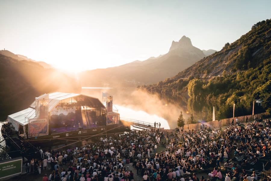 Y es que se trata de un festival único no solo por su selección de artistas. Su escenario flotante, bajo las faldas de la imponente peña Foratata con sus 2.321 metros de altura, es quizá su estampa más característica y reconocible. Escuchar los conciertos al aire libre abrazado por los paisajes naturales del valle de Tena o disfrutar de los atardeceres reflejados en las aguas del pantano, son experiencias que solo pueden vivirse en Pirineos Sur.